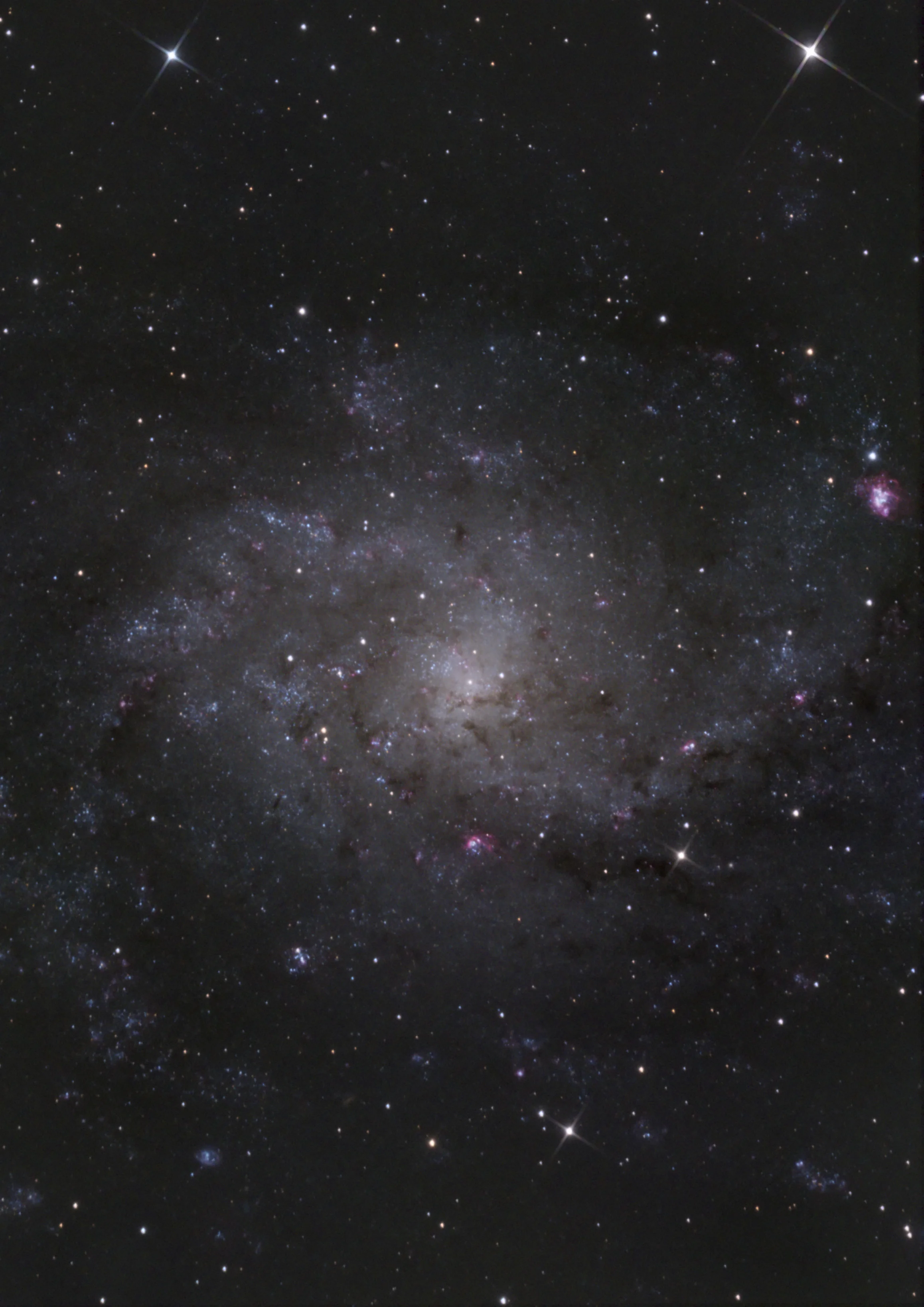 The Triangulum Galaxy is a spiral galaxy approximately 3 million light-years (ly) from Earth in the constellation Triangulum. It is catalogued as Messier 33 or NGC 598, and is sometimes informally referred to as the Pinwheel Galaxy, a nickname it shares with Messier 101. The Triangulum Galaxy is the third-largest member of the Local Group of galaxies, which includes the Milky Way, the Andromeda Galaxy and about 44 other smaller galaxies. It is one of the most distant permanent objects that can be viewed with the naked eye.