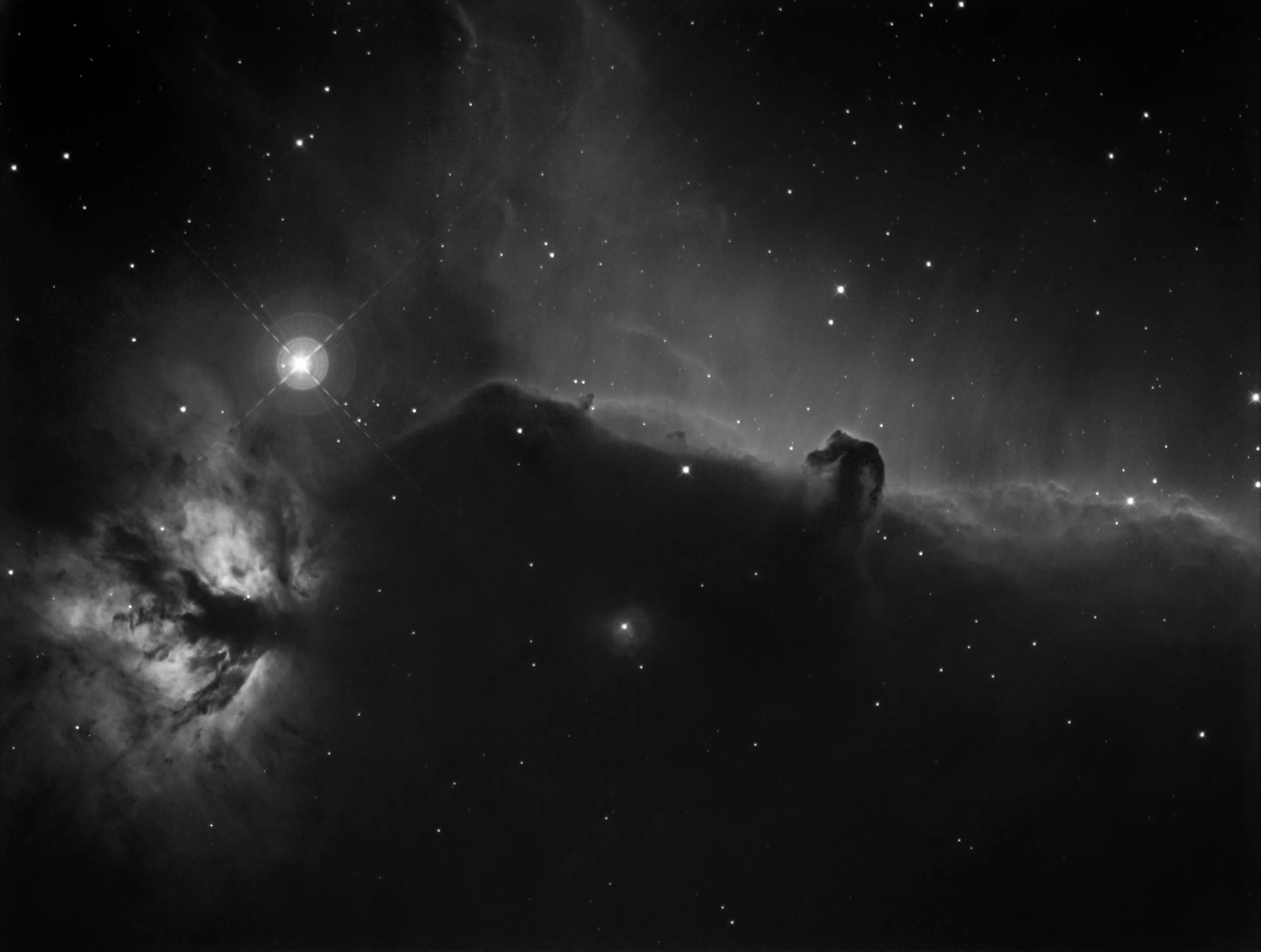 Horsehead Nebula, also known as Barnard 33, is a dark nebula located in the constellation Orion. It sits within the emission nebula IC 434, which is illuminated by the nearby star Sigma Orionis. The distinctive shape of the Horsehead Nebula resembles that of a horse's head, hence its name.