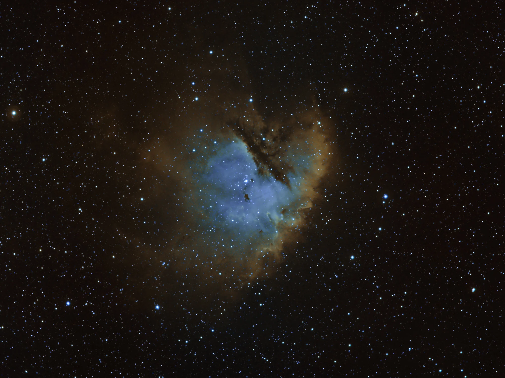 The nebula is visible in amateur telescopes from dark sky locations. In his book Deep Sky Wonders, Walter Scott Houston describes the appearance of the nebula in small telescopes:[3]